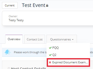 2) Now go onto the questionnaire where you have the expired document. This questionnaire will be visible with a 'red cross' next to it, as this indicates that the questionnaire is not complete / submitted.