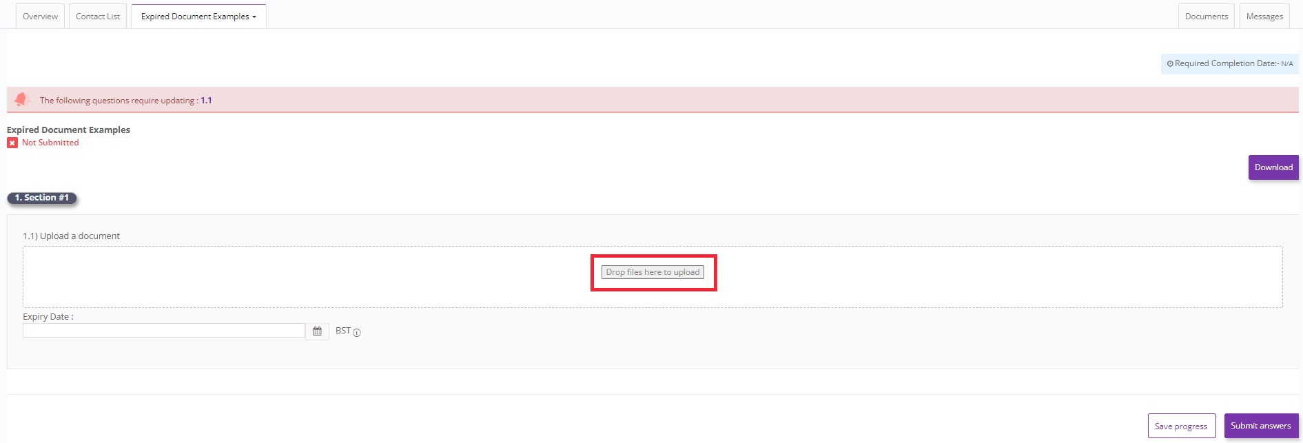 This will take you directly into the questionnaire where you have an expired document. Please upload new document and click submit to submit your new document. (follow steps 3-6 below)