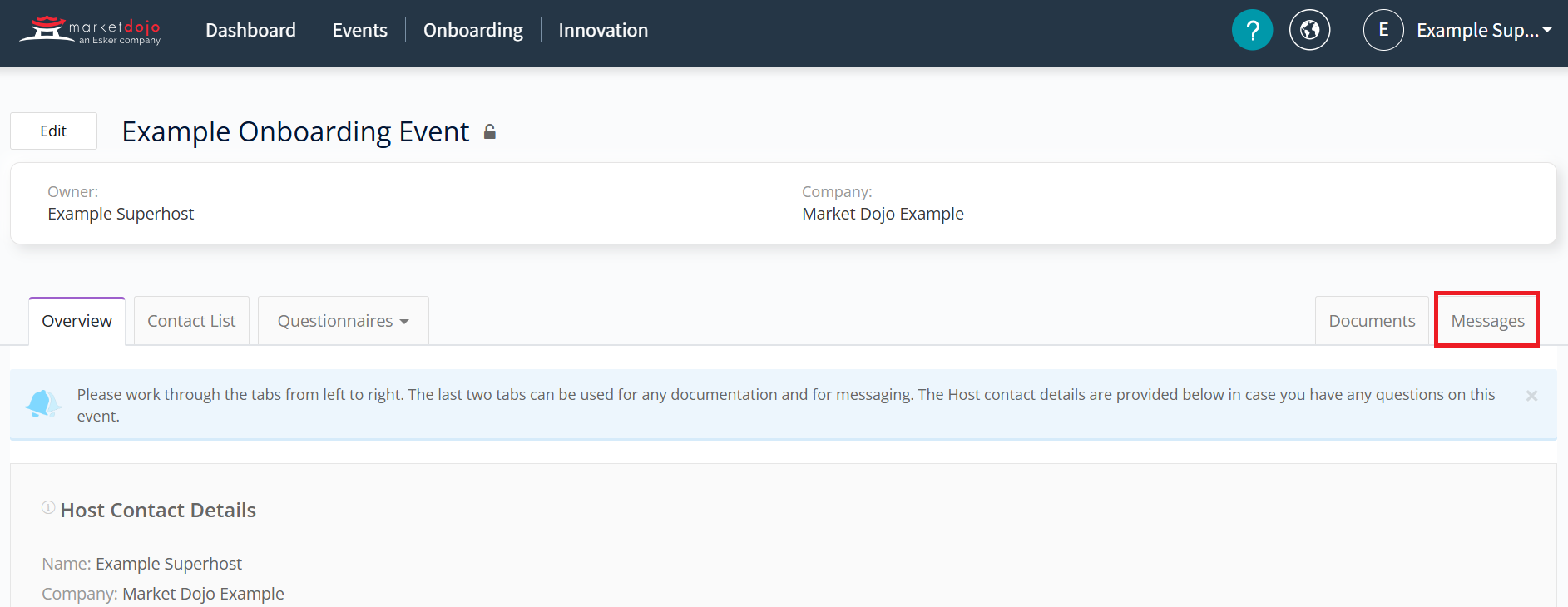 Open the Messages tab: Within the event, locate and select the "Messages" tab (far right of the page). This section serves as the Message Board for the event and will allow the host to post messages to you and for you to direct message your host if need be.