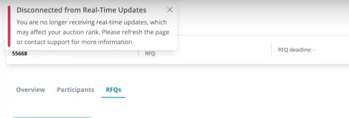 Now, if a user loses connection to live updates during an auction, a clear on-screen warning will appear, helping them take action and avoid confusion. This ensures all participants have the best chance to respond to bids as they happen and maintain a competitive edge.