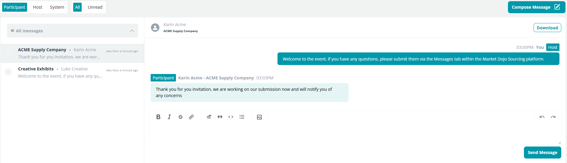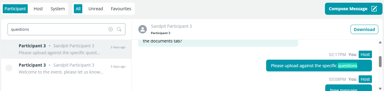 As per the host-to-host messaging, participants will see all messages within a single feed, with the indicators for host, participant and self sent messages.