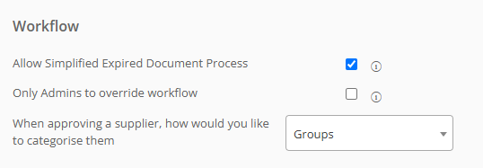 The workflow settings within the Supplier Onboarding allow you to set an overall workflow option for your expired documents and approval processes.